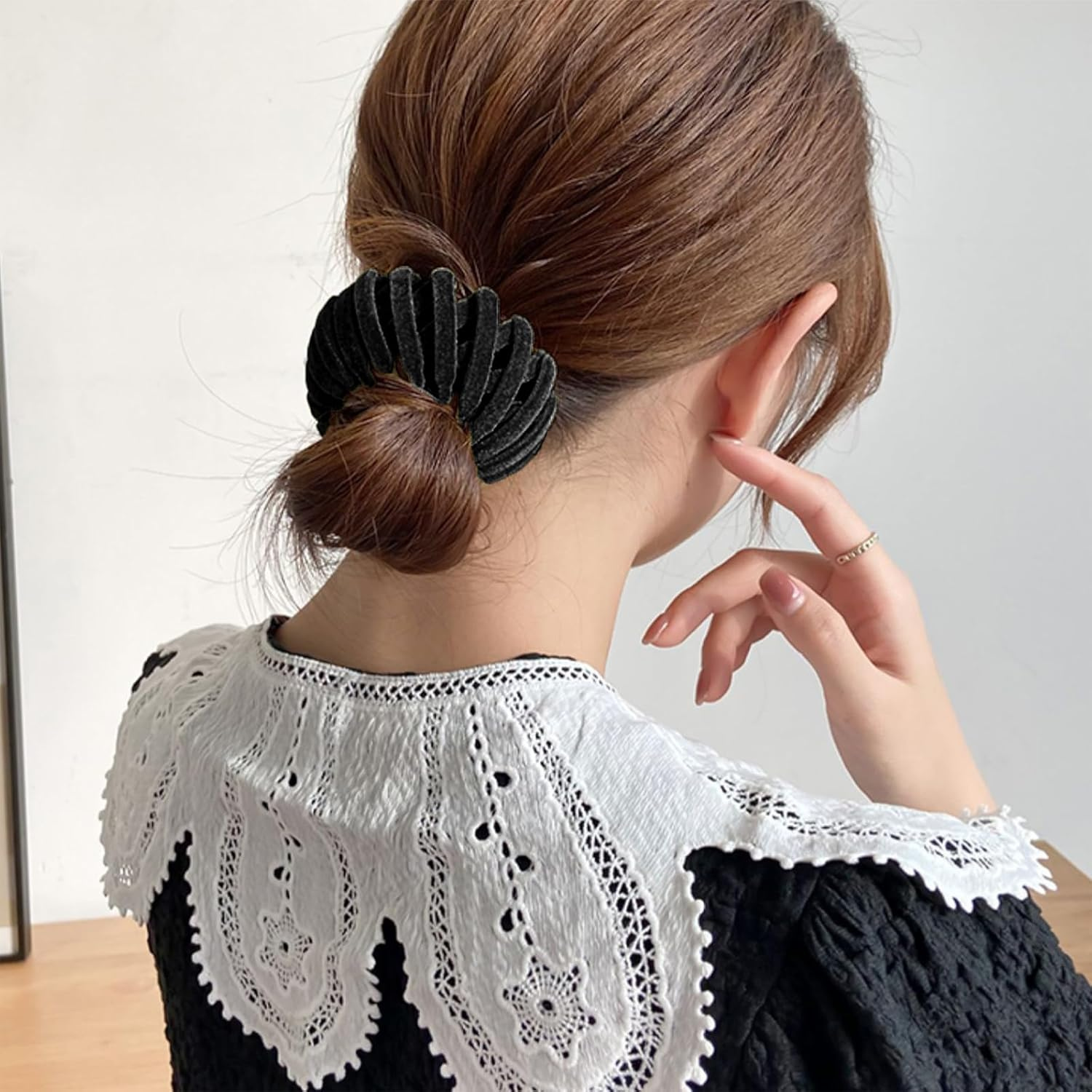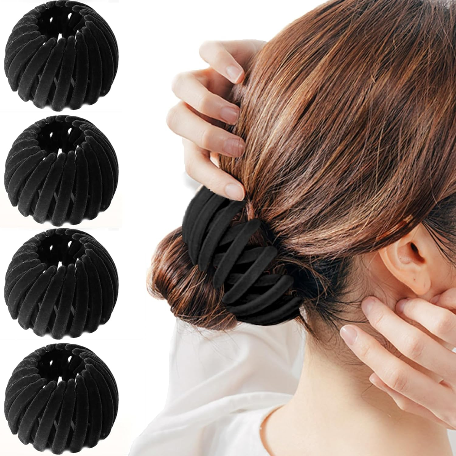 A set of 4 velvet birds nest hair clips in Black colors, designed for creating neat and elegant hairstyles for black color lovers. With an adjustable inner diameter from 1.0 to 3.5 inches, these flexible clips are perfect for various hair types and occasions, from daily wear to special events.